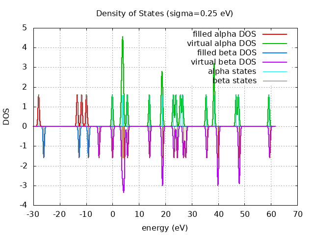 spin eig occ ---------------------------- alpha -27.98 1.00 alpha -13.35 1.00 alpha -11.71 1.00 alpha -9.85 1.00 alpha -0.08 0.00 alpha 3.42 0.00 alpha 3.79 0.00 alpha 3.82 0.00 alpha 4.08 0.00 alpha 5.57 0.00 alpha 13.90 0.00 alpha 18.63 0.00 alpha 18.88 0.00 alpha 23.05 0.00 alpha 24.03 0.00 alpha 25.70 0.00 alpha 26.58 0.00 alpha 35.46 0.00 alpha 38.43 0.00 alpha 38.45 0.00 alpha 46.80 0.00 alpha 47.72 0.00 alpha 59.24 0.00 beta -26.04 1.00 beta -12.65 1.00 beta -9.12 1.00 beta -5.10 0.00 beta 0.01 0.00 beta 3.52 0.00 beta 3.90 0.00 beta 4.22 0.00 beta 4.46 0.00 beta 5.67 0.00 beta 14.05 0.00 beta 18.86 0.00 beta 19.03 0.00 beta 23.29 0.00 beta 24.55 0.00 beta 26.91 0.00 beta 27.77 0.00 beta 35.73 0.00 beta 39.87 0.00 beta 40.04 0.00 beta 47.91 0.00 beta 48.13 0.00 beta 59.56 0.00