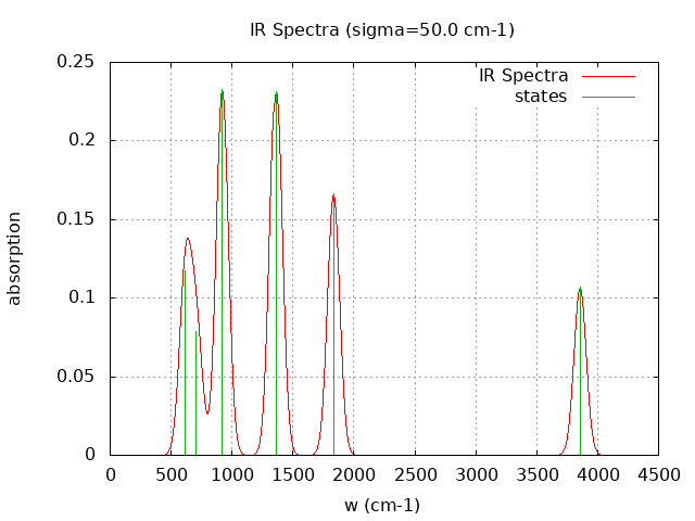 +----------------------------------------+ | Vibrational Density of States Analysis | +----------------------------------------+ Total number of frequencies = 12 Total number of negative frequencies = 0 Number of lowest frequencies = 0 (frequency threshold = 500 ) Exact dos norm = 6.000 Generating vibrational DOS Generating model vibrational DOS to have a proper norm 10.00 6.00 0.00 6.00 50.00 6.00 0.00 6.00 100.00 6.00 0.00 6.00 Generating IR Spectra Writing vibrational density of states (DOS) to vdos.dat Writing model vibrational density of states (DOS_FIXED) to vdos-model.dat Writing IR spectra to irdos.dat Temperature= 298.15 zero-point correction to energy = 13.281 kcal/mol ( 0.021165) vibrational contribution to enthalpy correction = 13.483 kcal/mol ( 0.021486) vibrational contribution to Entropy = 0.875 cal/mol-k hindered rotor enthalpy correction = 0.000 kcal/mol ( 0.000000) hindered rotor entropy correction = 0.000 cal/mol-k