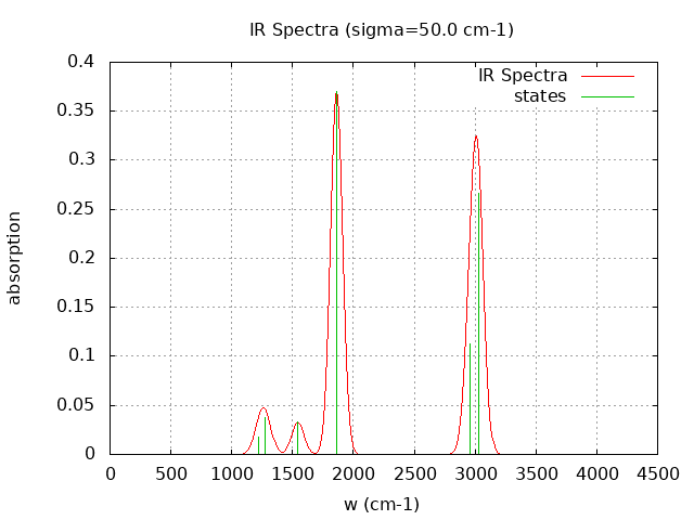 +----------------------------------------+ | Vibrational Density of States Analysis | +----------------------------------------+ Total number of frequencies = 12 Total number of negative frequencies = 0 Number of lowest frequencies = 0 (frequency threshold = 500 ) Exact dos norm = 6.000 Generating vibrational DOS Generating model vibrational DOS to have a proper norm 10.00 6.00 0.00 6.00 50.00 6.00 0.00 6.00 100.00 6.00 0.00 6.00 Generating IR Spectra Writing vibrational density of states (DOS) to vdos.dat Writing model vibrational density of states (DOS_FIXED) to vdos-model.dat Writing IR spectra to irdos.dat Temperature= 298.15 zero-point correction to energy = 16.992 kcal/mol ( 0.027079) vibrational contribution to enthalpy correction = 17.013 kcal/mol ( 0.027111) vibrational contribution to Entropy = 0.080 cal/mol-k hindered rotor enthalpy correction = 0.000 kcal/mol ( 0.000000) hindered rotor entropy correction = 0.000 cal/mol-k