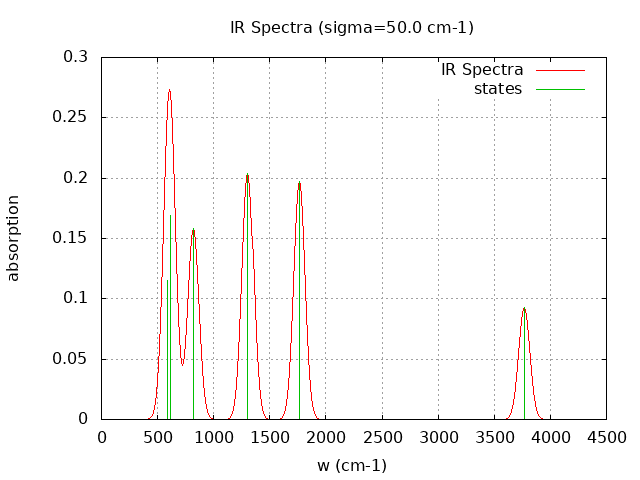 +----------------------------------------+ | Vibrational Density of States Analysis | +----------------------------------------+ Total number of frequencies = 12 Total number of negative frequencies = 0 Number of lowest frequencies = 0 (frequency threshold = 500 ) Exact dos norm = 6.000 Generating vibrational DOS Generating model vibrational DOS to have a proper norm 10.00 6.00 0.00 6.00 50.00 6.00 0.00 6.00 100.00 6.00 0.00 6.00 Generating IR Spectra Writing vibrational density of states (DOS) to vdos.dat Writing model vibrational density of states (DOS_FIXED) to vdos-model.dat Writing IR spectra to irdos.dat Temperature= 298.15 zero-point correction to energy = 12.656 kcal/mol ( 0.020168) vibrational contribution to enthalpy correction = 12.910 kcal/mol ( 0.020574) vibrational contribution to Entropy = 1.122 cal/mol-k hindered rotor enthalpy correction = 0.000 kcal/mol ( 0.000000) hindered rotor entropy correction = 0.000 cal/mol-k