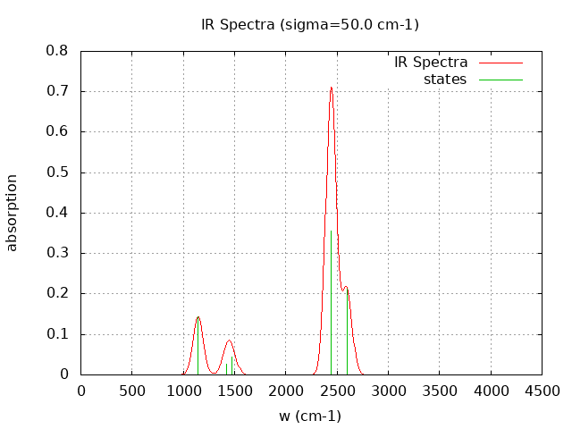 +----------------------------------------+ | Vibrational Density of States Analysis | +----------------------------------------+ Total number of frequencies = 15 Total number of negative frequencies = 0 Number of lowest frequencies = 0 (frequency threshold = 500 ) Exact dos norm = 9.000 Generating vibrational DOS Generating model vibrational DOS to have a proper norm 10.00 9.00 0.00 9.00 50.00 9.00 0.00 9.00 100.00 9.00 0.00 9.00 Generating IR Spectra Writing vibrational density of states (DOS) to vdos.dat Writing model vibrational density of states (DOS_FIXED) to vdos-model.dat Writing IR spectra to irdos.dat Temperature= 298.15 zero-point correction to energy = 21.817 kcal/mol ( 0.034768) vibrational contribution to enthalpy correction = 21.867 kcal/mol ( 0.034847) vibrational contribution to Entropy = 0.195 cal/mol-k hindered rotor enthalpy correction = 0.000 kcal/mol ( 0.000000) hindered rotor entropy correction = 0.000 cal/mol-k