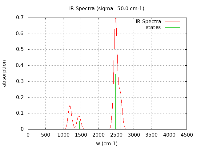 +----------------------------------------+ | Vibrational Density of States Analysis | +----------------------------------------+ Total number of frequencies = 15 Total number of negative frequencies = 0 Number of lowest frequencies = 0 (frequency threshold = 500 ) Exact dos norm = 9.000 Generating vibrational DOS Generating model vibrational DOS to have a proper norm 10.00 9.00 0.00 9.00 50.00 9.00 0.00 9.00 100.00 9.00 0.00 9.00 Generating IR Spectra Writing vibrational density of states (DOS) to vdos.dat Writing model vibrational density of states (DOS_FIXED) to vdos-model.dat Writing IR spectra to irdos.dat Temperature= 298.15 zero-point correction to energy = 22.032 kcal/mol ( 0.035110) vibrational contribution to enthalpy correction = 22.079 kcal/mol ( 0.035185) vibrational contribution to Entropy = 0.185 cal/mol-k hindered rotor enthalpy correction = 0.000 kcal/mol ( 0.000000) hindered rotor entropy correction = 0.000 cal/mol-k