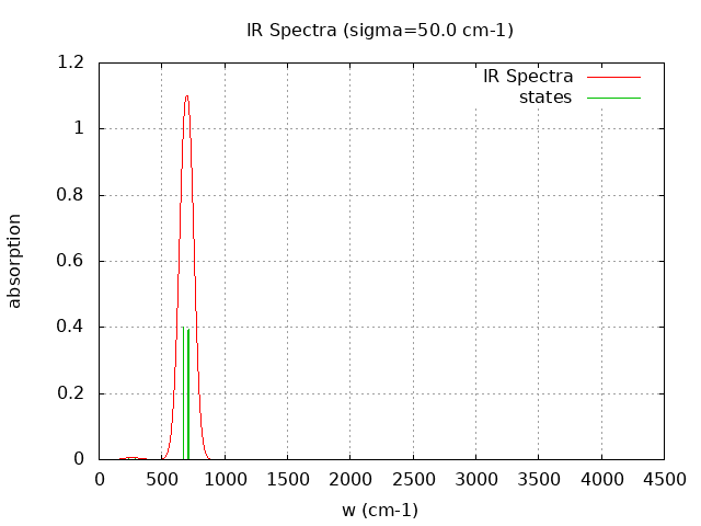 +----------------------------------------+ | Vibrational Density of States Analysis | +----------------------------------------+ Total number of frequencies = 15 Total number of negative frequencies = 0 Number of lowest frequencies = 6 (frequency threshold = 500 ) Exact dos norm = 9.000 Generating vibrational DOS Generating model vibrational DOS to have a proper norm 10.00 9.00 6.00 9.00 50.00 9.00 6.00 9.00 100.00 8.92 5.92 9.00 Generating IR Spectra Writing vibrational density of states (DOS) to vdos.dat Writing model vibrational density of states (DOS_FIXED) to vdos-model.dat Writing IR spectra to irdos.dat Temperature= 298.15 zero-point correction to energy = 5.246 kcal/mol ( 0.008360) vibrational contribution to enthalpy correction = 7.256 kcal/mol ( 0.011564) vibrational contribution to Entropy = 11.300 cal/mol-k hindered rotor enthalpy correction = 0.000 kcal/mol ( 0.000000) hindered rotor entropy correction = 0.000 cal/mol-k