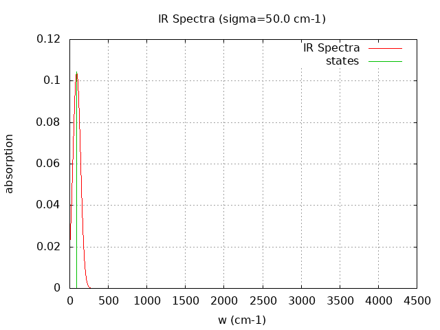 +----------------------------------------+ | Vibrational Density of States Analysis | +----------------------------------------+ Total number of frequencies = 6 Total number of negative frequencies = 0 Number of lowest frequencies = 1 (frequency threshold = 500 ) Exact dos norm = 0.000 Generating vibrational DOS Generating model vibrational DOS to have a proper norm 10.00 1.00 1.00 0.00 50.00 0.97 0.97 0.00 100.00 0.82 0.82 0.00 Generating IR Spectra Writing vibrational density of states (DOS) to vdos.dat Writing model vibrational density of states (DOS_FIXED) to vdos-model.dat Writing IR spectra to irdos.dat Temperature= 298.15 zero-point correction to energy = 0.131 kcal/mol ( 0.000208) vibrational contribution to enthalpy correction = 0.602 kcal/mol ( 0.000959) vibrational contribution to Entropy = 3.626 cal/mol-k hindered rotor enthalpy correction = 0.000 kcal/mol ( 0.000000) hindered rotor entropy correction = 0.000 cal/mol-k