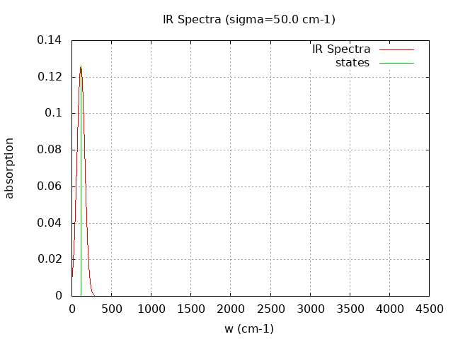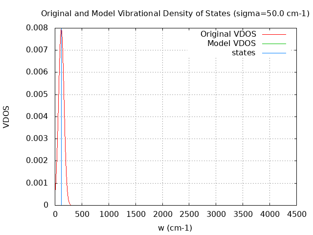 +----------------------------------------+ | Vibrational Density of States Analysis | +----------------------------------------+ Total number of frequencies = 6 Total number of negative frequencies = 0 Number of lowest frequencies = 1 (frequency threshold = 500 ) Exact dos norm = 0.000 Generating vibrational DOS Generating model vibrational DOS to have a proper norm 10.00 1.00 1.00 0.00 50.00 0.99 0.99 0.00 100.00 0.88 0.88 0.00 Generating IR Spectra Writing vibrational density of states (DOS) to vdos.dat Writing model vibrational density of states (DOS_FIXED) to vdos-model.dat Writing IR spectra to irdos.dat Temperature= 298.15 zero-point correction to energy = 0.165 kcal/mol ( 0.000264) vibrational contribution to enthalpy correction = 0.608 kcal/mol ( 0.000968) vibrational contribution to Entropy = 3.168 cal/mol-k hindered rotor enthalpy correction = 0.000 kcal/mol ( 0.000000) hindered rotor entropy correction = 0.000 cal/mol-k