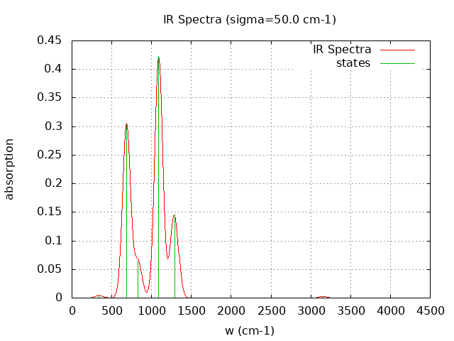 +----------------------------------------+ | Vibrational Density of States Analysis | +----------------------------------------+ Total number of frequencies = 12 Total number of negative frequencies = 0 Number of lowest frequencies = 1 (frequency threshold = 500 ) Exact dos norm = 6.000 Generating vibrational DOS Generating model vibrational DOS to have a proper norm 10.00 6.00 1.00 6.00 50.00 6.00 1.00 6.00 100.00 6.00 1.00 6.00 Generating IR Spectra Writing vibrational density of states (DOS) to vdos.dat Writing model vibrational density of states (DOS_FIXED) to vdos-model.dat Writing IR spectra to irdos.dat Temperature= 298.15 zero-point correction to energy = 10.558 kcal/mol ( 0.016825) vibrational contribution to enthalpy correction = 10.932 kcal/mol ( 0.017422) vibrational contribution to Entropy = 1.803 cal/mol-k hindered rotor enthalpy correction = 0.000 kcal/mol ( 0.000000) hindered rotor entropy correction = 0.000 cal/mol-k