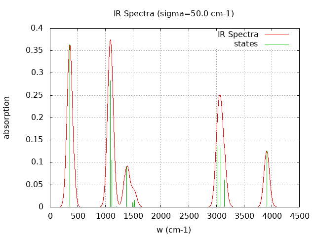 +----------------------------------------+ | Vibrational Density of States Analysis | +----------------------------------------+ Total number of frequencies = 18 Total number of negative frequencies = 0 Number of lowest frequencies = 1 (frequency threshold = 500 ) Exact dos norm = 12.000 Generating vibrational DOS Generating model vibrational DOS to have a proper norm 10.00 12.00 1.00 12.00 50.00 12.00 1.00 12.00 100.00 12.00 1.00 12.00 Generating IR Spectra Writing vibrational density of states (DOS) to vdos.dat Writing model vibrational density of states (DOS_FIXED) to vdos-model.dat Writing IR spectra to irdos.dat Temperature= 298.15 zero-point correction to energy = 32.620 kcal/mol ( 0.051983) vibrational contribution to enthalpy correction = 32.896 kcal/mol ( 0.052423) vibrational contribution to Entropy = 1.346 cal/mol-k hindered rotor enthalpy correction = 0.000 kcal/mol ( 0.000000) hindered rotor entropy correction = 0.000 cal/mol-k